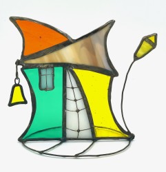 Domek je vytvořen technikou Tiffany a cínování. Barevná skla propouští sluneční paprsky nebo jiný zdroj světla a vytváří krásné barevné stíny. Je vhodné umístit ho například na parapet, nebo za něj postavit svíčku.