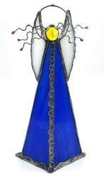 Anděl je vytvořen technikou Tiffany a cínování. Je z krásného modrého poloprůsvitného skla.